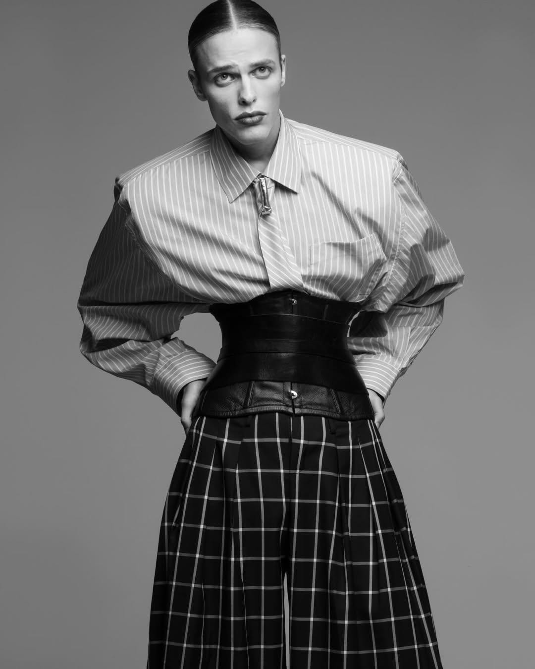 The SHAO Striped shirts and windowpane trousers worn in Numéro Netherlands