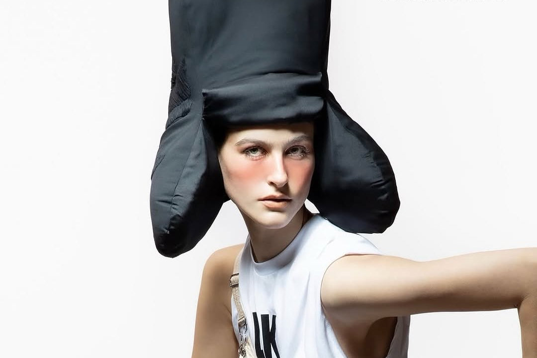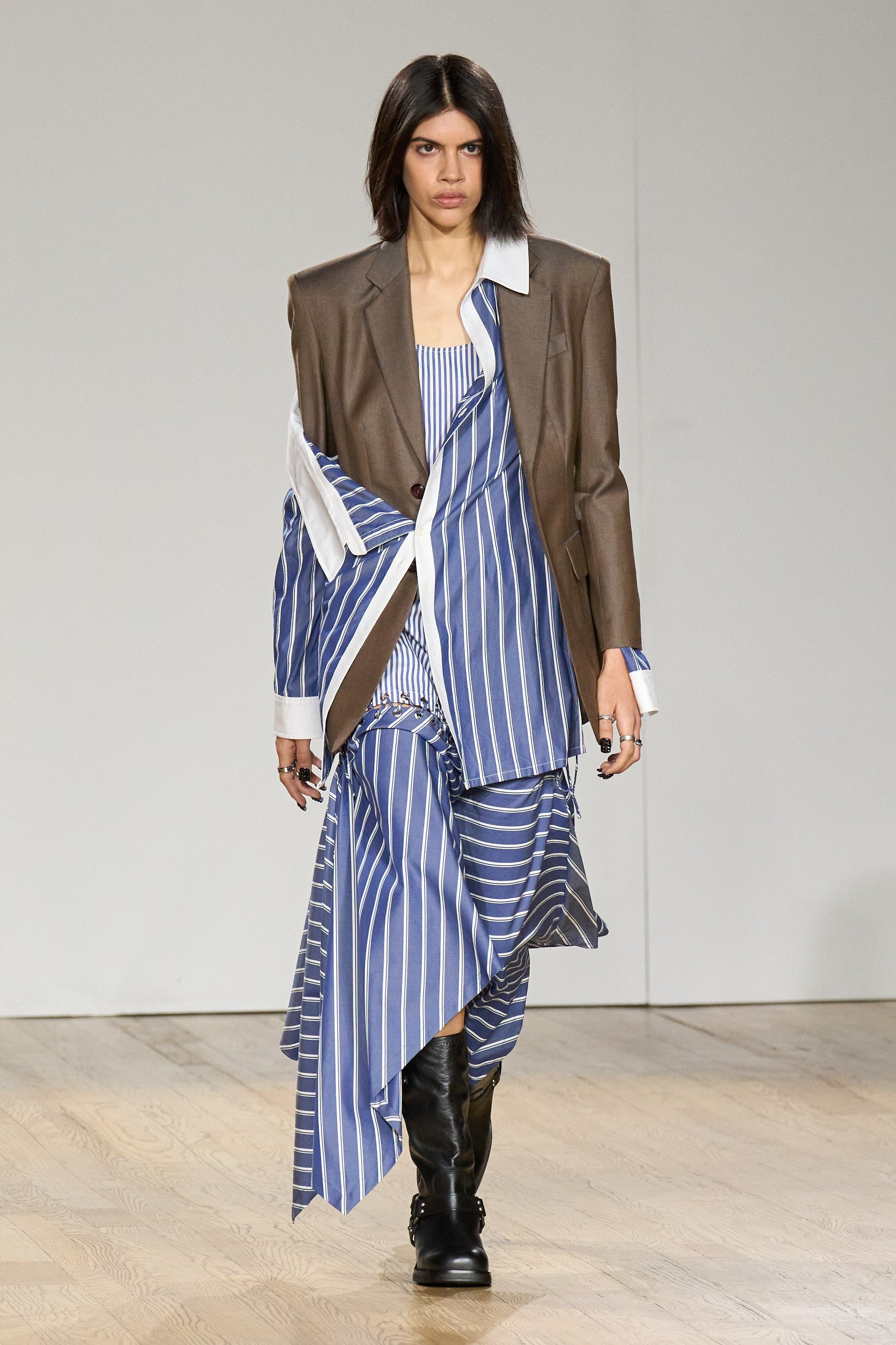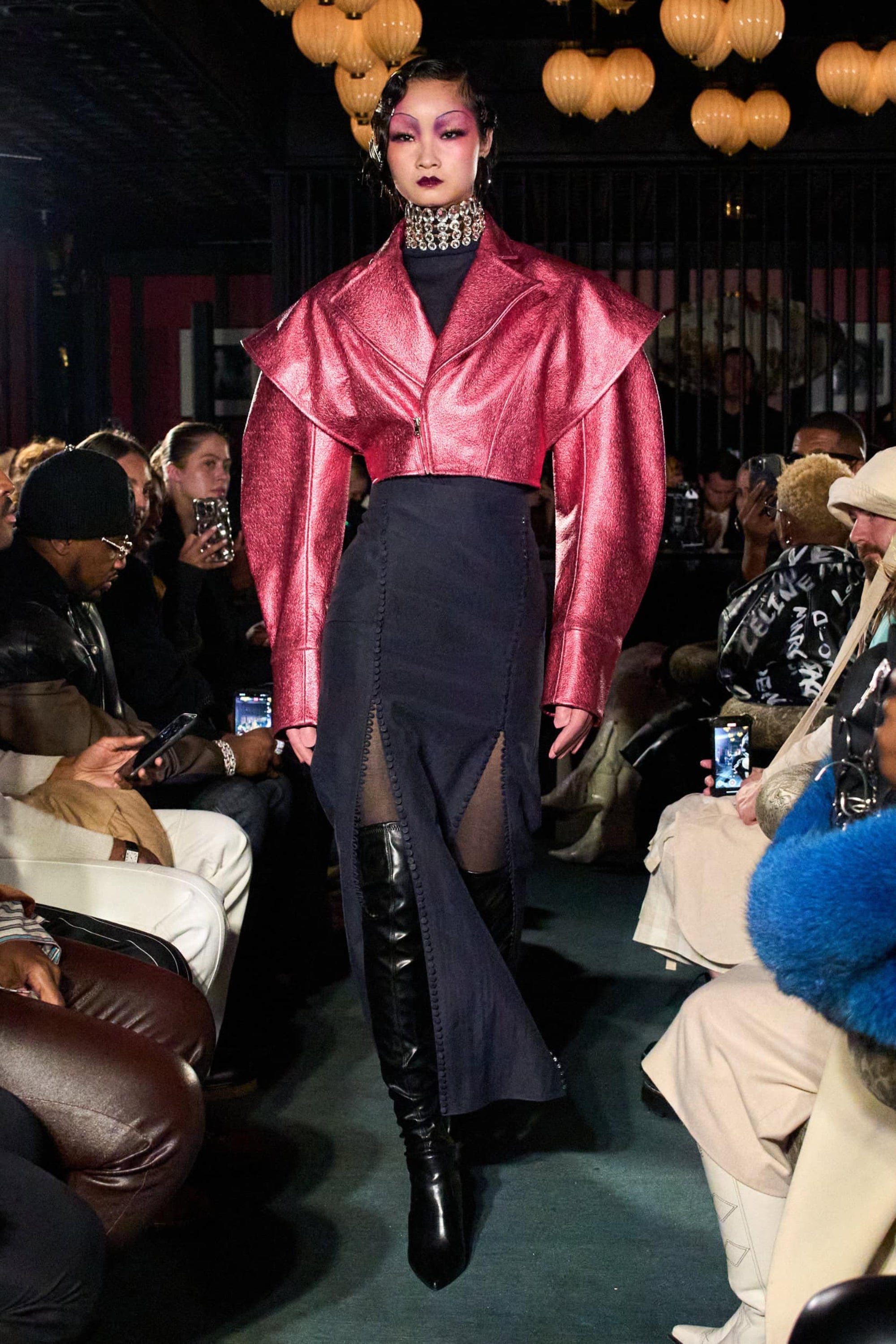 Dark indigo denim in formal territory—forces conversations about material hierarchy and occasion-appropriate dressing through sheer structural audacity.