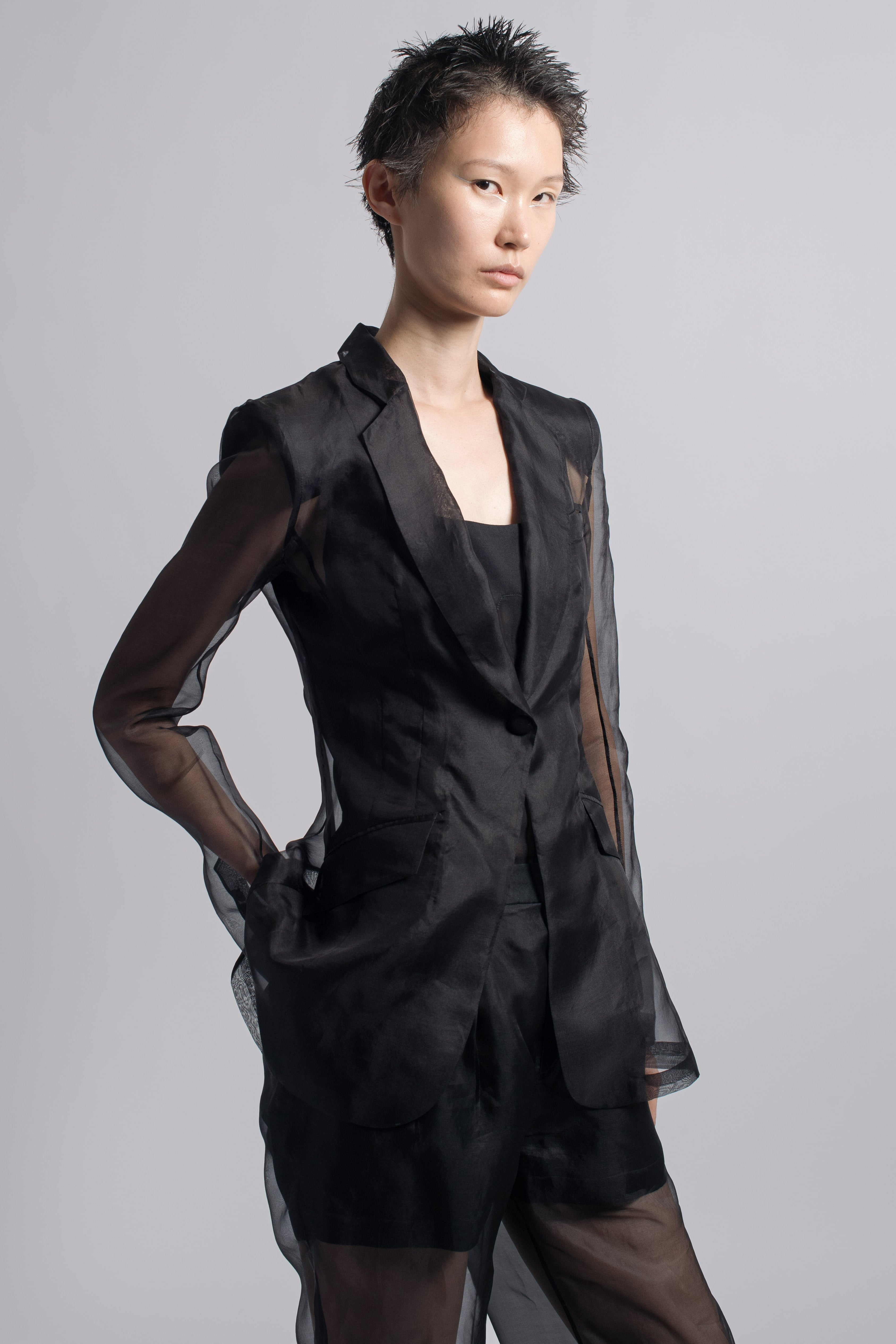• Long sleeves with fitted cuffs maintaining structured proportion balance